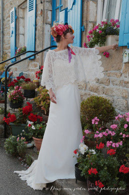 {Tulle brodé et crèpe prado, dentelle type guîpure}